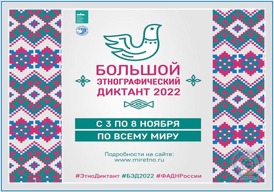 «Большой этнографический диктант 2022» — это Всероссийская акция просветительская акция, которая позволит оценить уровень этнографической грамотности населения, их знания о народах, проживающих в Российской Федерации.